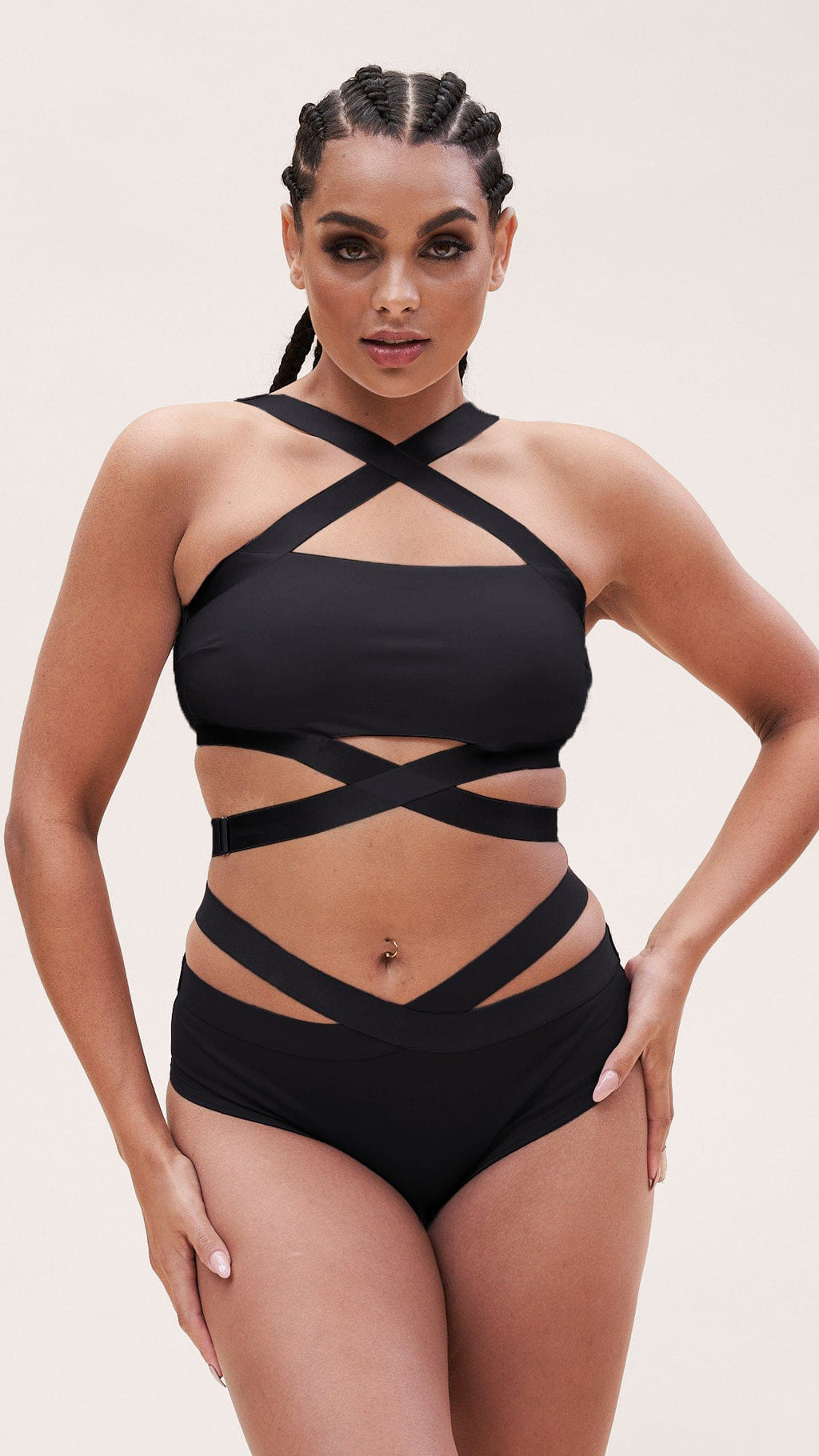 Claire Bottom - Strappy Adjustable Mesh Cut Out High Waist Shorts Black