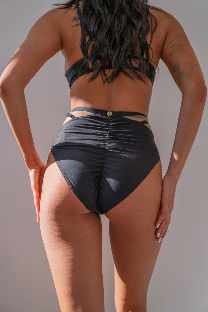 With a high waist, these bottoms hug your figure and accentuate your curves (with that scrunch bum gathering) whilst keeping your comfortable and secure. Whilst being comfortable, the mesh cutouts at the waist let a bit of skin peek through despite the fuller coverage design.