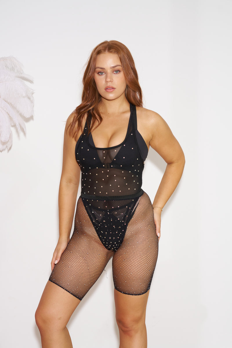 The Chloe Diamonte Shorts are the perfect outfit topper. Completely mesh and sheer, with glistening diamontes throughout, this piece will elevate your basic pole fits to showcase worthy and standout outfits.